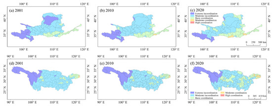 Spatiotemporal CCDs between UL and EEQ in the YYRBs in 2001, 2010, and 2020. Note: (a–c) represent the spatiotemporal CCDs between UL and EEQ in the YLRB in 2001, 2010, and 2020, respectively; (d–f) represent the spatiotemporal CCDs between UL and EEQ in the YTRB in 2001, 2010, and 2020, respectively.