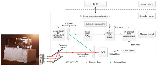 The L3DIS mainly consists of laser emission, laser deflection, laser reception, and time measurement units, as shown in Figure 4 [19,20]. The laser emission is composed of the laser control and drive, the laser source, and the DOE. A semiconductor laser is driven by a laser driver to emit a short pulse, which is beam-split into two parts. One part is received by the main wave detector, which starts the time measurement unit and records the start time of the laser pulse; the other part is formed into a 16-channel laser after DOE splitting, which is emitted out of the system through the laser deflection structure.