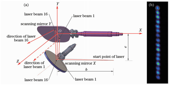 Schematic diagram of double galvanometers: (a) dual mirrors with rotation axis; (b) 16-beam spots in far-field [19,20].