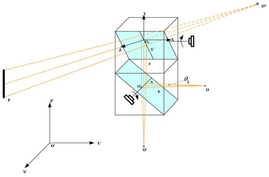Figure 6 illustrates the geometric model of the L3DIS. The 3D point cloud can be computed using the raw observation of the horizontal and vertical angles and ranges of the 16 channels. The origin of coordinate O is set as the laser emission origin. OX and OY are the centers of the dual mirrors. θk is the angle between OS and OOX. S’ is the intersection of the second mirror and the reflection of the beam. O’ is the symmetry point of the lower mirror of O, while O” is the symmetry point of the top mirror of O’. P is laser spots on a target’s surface. Then, we can define the geometric model of the scanner as OY-XYZ, and the user coordinate system as O’-XYZ. R is the length of the PS’. According to the geometric relationship, the raw observations (R, θx, θy) can be calculated to the coordinates of point P (XP, YP, ZP) in the scanner coordinate system [21], shown as Equation (1), where e is the distance between the centers of the two galvanometric mirrors.
