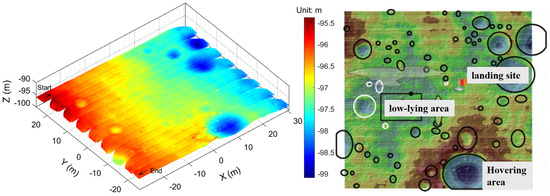 The measurement results of the L3DIS during the landing process of Chang’E-3 [21]: the white circles represent low-lying areas and black shapes represent craters.