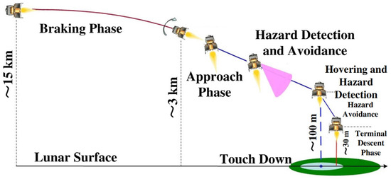 - De Lafontaine, J.; Neveu, D.; Lebel, K. Autonomous planetary landing using a lidar sensor: The closed-loop system. In Proceedings of the Guidance, Navigation and Control Systems, Loutraki, Greece, 17–20 October 2005. [Google Scholar]