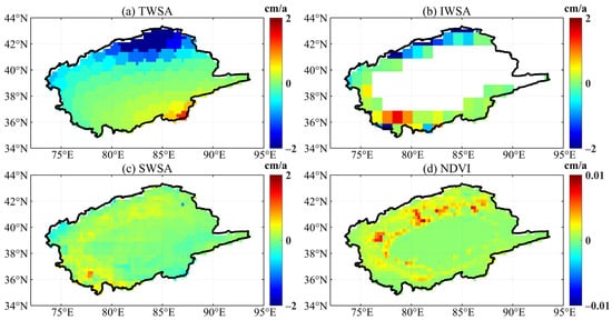 Spatial changes of water storage and NDVI in the Tarim River Basin. Among them, IWSA is only given for the period from April 2002 to January 2020, while the remaining data are all given for the period from April 2002 to December 2022.