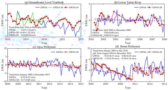 Furthermore, we also introduce other measured groundwater data for comparative analysis. As shown in Figure 4b,c, GWSA and GWSA-M in the lower reaches of the Tarim River showed decreasing trends, and their RMSE reached 0.94 cm. GWSA and GWSA-M in the Aksu Prefecture continued to decline at rates of −0.52 ± 0.23 cm/a and −0.17 ± 0.09 cm/a, respectively. The lower levels of GWSA and GWSA-M in the Hotan Prefecture were concentrated in 2010. The above analysis reveals that the GRACE/GFO-derived GWSA is consistent with the GWSA-M.