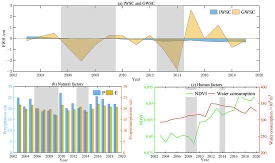 Annual changes of IWS, GWS, and natural/human factors in the Tarim River Basin. The shaded areas represent periods of notable declines in GWSC.