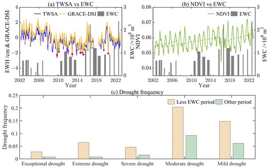 Temporal changes of TWSA, NDVI, and EWC, and the frequency of drought conditions in the lower reaches of the Tarim River. (a) The red dots represent exceptional drought, the purple diamonds represent extreme drought, and the green squares represent severe drought. (b) Temporal changes of NDVI and EWC, and the green dotted lines indicate the trends of NDVI during the periods. (c) The frequency of drought conditions in the lower reaches of the Tarim River.