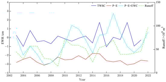 Annual TWSC, net precipitation (P − E), water balance result (P − E + EWC), and runoff of the Tarim River mainstream.