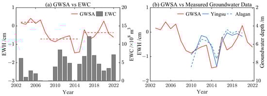 Figure 9a shows the temporal changes of GRACE/GFO-derived GWSA and EWC. During the lower EWC period, the annual mean GWSA reduced by 0.91 cm compared to 2003−2006. Subsequently, the annual mean GWSA shows a reduction, reaching a value of 0.35 cm between 2016 and 2022. In particular, two local minima in GWSA were observed in the 2009−2010 and 2014−2015 periods. These phenomena can be attributed to the extremely low EWC in 2009 and 2014, coupled with the lagged response of GWSA to reflect the implementation of EWC in the latter halves of 2010 and 2015 [,].