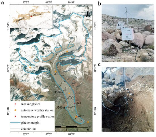(a) Location of the Koxkar Glacier, weather stations, and observation stations: true-color remote-sensing images of the Koxkar glacier. (b) Temperature observation equipment for debris profiles and (c) distribution of temperature probes.