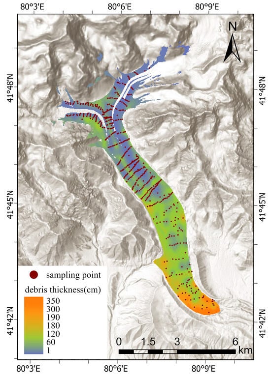 Debris refers to the rocky material accumulated on the surface of a glacier, and a glacier where the majority of the ablation area is covered by continuous surface debris is classified as a debris-covered glacier []. Debris-covered glaciers are widely distributed across regions such as the Tian Shan, the Himalayas, the Alps, and the Andes, comprising approximately 7.3% of the global glacier-covered area [,,]. The presence of debris alters the energy exchange between the glacier and the atmosphere, significantly impacting glacier ablation. Studies have shown that debris, with its low albedo, significantly absorbs solar radiation. Consequently, a thin layer of debris accelerates the ablation of the underlying ice. However, once the debris exceeds a certain thickness, it acts as an insulating layer, reducing the glacier melt due to its thermal resistance [,,,]. Therefore, obtaining precise data on the spatial distribution of debris is crucial for understanding the ablation processes and mass balance of debris-covered glaciers [,]. Currently, due to the limited data on regional debris thickness, most regional or global glacier models struggle to accurately assess the impact of debris. Some models use a simplified approach by utilizing different ablation factors for bare ice and debris-covered areas, which may significantly reduce the accuracy of glacier ablation estimates [,,]. Therefore, precise measurements of debris thickness are essential for improving predictions of glacier changes and assessing changes in glacier runoff and its impacts [,,].