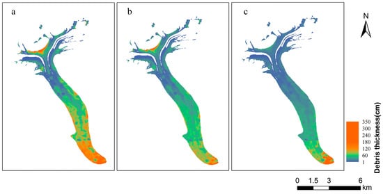 Spatial distribution of debris thickness on the Koxkar Glacier, as measured using (a) empirical relationship approach, (b) empirical relationship approach 2, and (c) energy balance of debris approach.