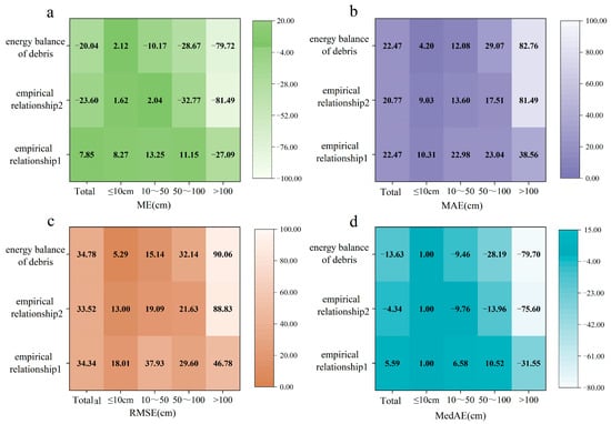 To evaluate the accuracy and applicability of the different approaches across different debris thickness ranges, this study classified the ablation zone debris into four thickness layers: thin (0 to 10 cm), medium–thin (10 to 50 cm), medium–thick (50 to 100 cm), and thick (greater than 100 cm) based on the measured thickness. Figure 5 presents the error statistics for each debris thickness layer when different estimation approaches are used. The analysis indicates that empirical relationship approach 1 tends to overestimate the debris thickness across the glacier, whereas empirical relationship approach 2 and the energy balance of debris approach exhibit significant underestimation. All three approaches show considerable underestimation when evaluating thick debris layers, and empirical relationship approach 2 and the energy balance of debris approach underestimate much more than empirical relationship approach 1 (Figure 5a). As the thickness of the debris layers increases, the accuracy of the estimation methods declines significantly (Figure 5b–d), underscoring the clear inverse relationship between the debris thickness and the precision of estimations. This observation emphasizes that achieving accurate estimations for thick debris layers continues to present a substantial challenge, particularly for glaciers characterized by extensive debris accumulation.