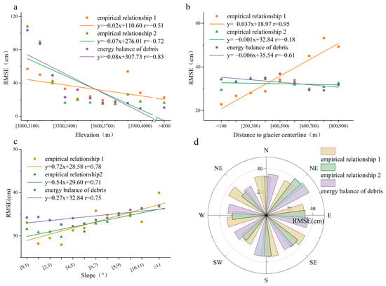 Topographic factors such as the elevation, slope, and aspect interact with the distribution of supraglacial debris thickness, forming a relatively complex relationship []. To further explore the influence of each topographic factor of the glacier on each estimation approach, the debris-covered area of the Koxkar Glacier was divided into regions based on the elevation, distance from the glacier flow line, slope, and aspect, respectively. Figure 6 shows the results of the correlation analysis between each factor and the RMSE of the estimation approaches.