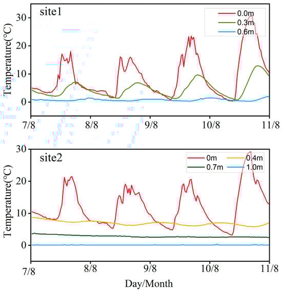 Temperature variations at different depths of the debris at the debris thickness 60 cm (site1) and the debris thickness 100 cm (site2).