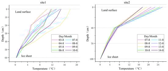 Temperature curve of debris profiles at 13:00 on multiple days for the debris thickness 60 cm (site1) and the debris thickness 100 cm (site2).