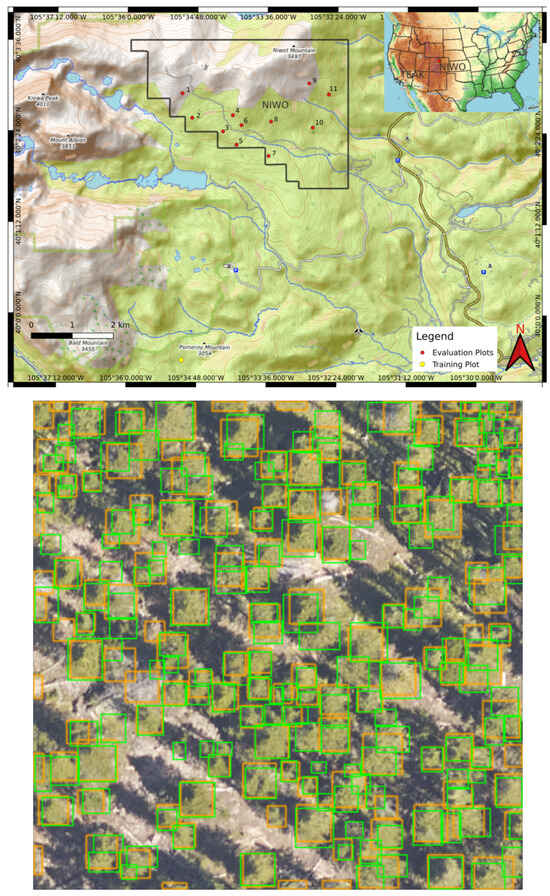 (Top) A map of the geolocations of plots used in the training and test sets at Niwot. Red dots indicate the locations of plots used for the test set, while the yellow dot marks the location of the plot used for the training set. The black boundary outlines the extent of NEON’s sampling area for the NIWO site. (bottom) Ground truth and DeepForest predicted bounding boxes for plot number 8 at NIWO after training the model with optimal rule parameters found using random search. The ground truth bounding boxes are depicted in green, and the DeepForest predictions are in orange.