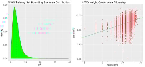 The dataset contains a single class—tree. We split the data into training, validation, and test sets. The sizes of these sets are 10,757, 1655, and 1624 annotations, respectively. The distribution of the crown area (derived from the crown delineations) and the height-crown area allometry (the relationship between each tree’s crown area and its height, derived from the canopy height model) are shown in Figure 4.