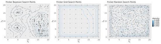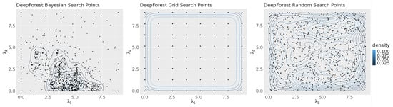 Figure 5 shows a density map of the points in the search space selected by each search algorithm. The figure highlights the differences in the search algorithms’ strategies. Bayesian optimization attempts to focus its search on areas of the plane that are likely to give optimum results, as can be seen by the high point density in the region near the axis of its graph. Grid search evenly distributes its points across the plane and random search chooses points at random, as reflected by the graph’s lack of structure.