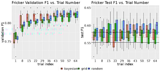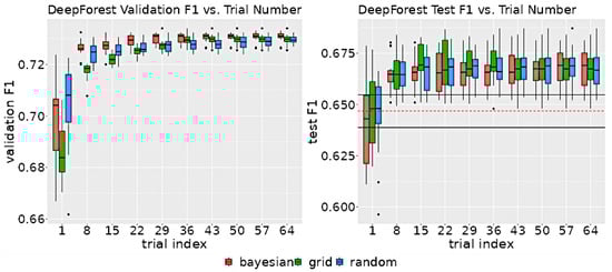 Figure 11 shows the distribution of the model validation set and test set F1 scores as a function of the number of trials. The median of the validation distribution for all 3 algorithms increases up to 8 trials and remains relatively flat after 43 trials.