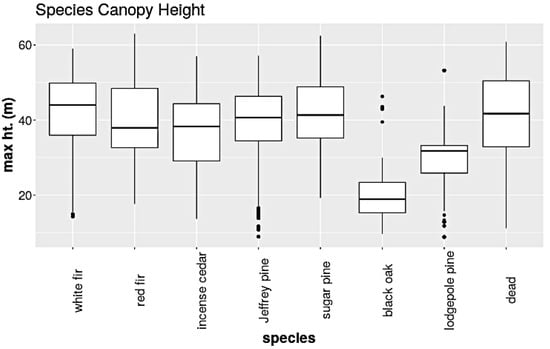 We will use the observed crown heights to help improve the model’s overall performance. We extend rules 1 and 2 from [61], which are based on the differences in crown height distributions. Rule 1 states that trees taller than 46.0 m are unlikely to be black oak. Rule 2 states that trees taller than 53.2 m are unlikely to be lodgepole pine. Note from the distributions that the majority of black oaks are less than 46 m in height and the majority of lodgepole pines are less than 53.2 m. We implement these rules by first creating our functions:
