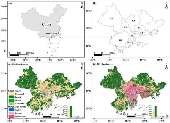 Figure 1. The location of the PRDUA (a,b), and its land-cover maps in 1985 (c) and 2021 (d), respectively.