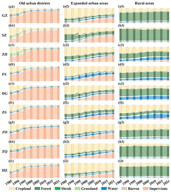 Figure 2. The state and change flows of land cover in nine cities in the PRDUA from 1985 to 2021. Regarding subplot numbering, letters represent cities, and numbers indicate urban subregions.