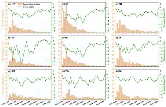 Figure 3. Dynamic degrees of green spaces in the expanded urban areas in nine cities in the PRDUA during 1985–2021.