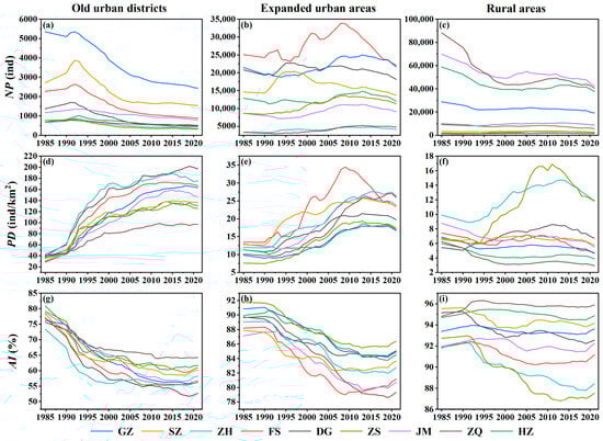Figure 4. (ai) The changes in landscape metrics of green spaces in nine cities in the PRDUA during 1985–2021.