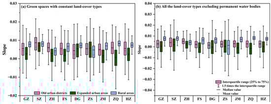 Figure 5. Box plots of trends in annual NDVI in nine cities in the PRDUA during 1986–2021. (a) represents green spaces with constant land-cover types during the study period, and (b) represents all the land-cover types, excluding permanent water bodies.