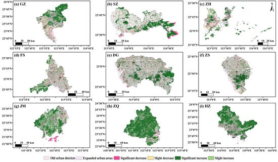 When considering all the land-cover types within the given region, excluding permanent water bodies, the NDVI also showed a dominant increasing trend in the old urban districts and rural areas of nine cities (Figure 5b). However, nearly half, or even more than half, of the grids exhibited a negative trend in NDVI in the expanded urban areas across most cities. Similarly, an evident urban–rural gradient was observed in the NDVI trend. Specifically, seven cities showed the order of the NDVI trend as follows: rural areas > old urban districts > expanded urban areas. Moreover, the NDVI trends in the old urban districts of all cities were consistently greater than those of the expanded urban areas. These results further indicate that urbanization has a discernible adverse impact on regional NDVI, particularly in the expanded urban areas. Comparing Figure 5a with Figure 5b, it was evident that when the NDVI trend values across all land-cover types were pooled for analysis, the average values of the NDVI trends in different city areas were smaller than those in the corresponding area’s green spaces with constant land-cover types. This result can be attributed to the effects of land-cover changes, such as the conversion of some green spaces to impervious surfaces. Among nine cities, Zhongshan exhibited the distinct urban–rural gradient of NDVI trends, with the old urban districts > expanded urban areas > rural areas. This suggests that urbanization has a positive influence on vegetation therein.