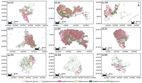 Figure 6. Spatial patterns of trends in annual NDVI in areas with constant land-cover types in nine cities in the PRDUA during 1986–2021.