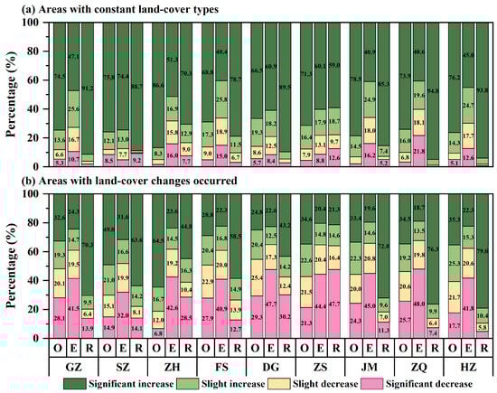 Figure 8. The frequency distributions of trends in annual NDVI in different city subregions where land-cover change did not occur (a) or occurred (b) during 1986–2021. O, E, and R indicate the old urban districts, expanded urban areas, and rural areas, respectively.