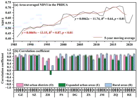 Figure 9. The change in area-averaged NDVI in the PRDUA during 1986–2021 (a) and correlation of annual NDVI in different city subregions with the PRDUA average (b). The solid-colored bars represent the relationship between annual NDVI in areas with constant land-cover types and the PRDUA average, while the bars with forward slashes indicate the relationship between the areas excluding permanent water bodies and the PRDUA average. ** indicate the trends significant at p < 0.01.