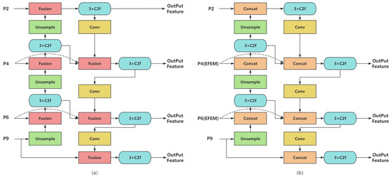 With increased backbone depth, spatial information for smaller objects is often lost. To mitigate this, we restructured YOLOv8’s original PA-FPN multi-scale fusion and introduced the Spatial-Context-Guided Bidirectional Feature Pyramid Network (SCGBiFPN), illustrated in Figure 5. The SCGBiFPN includes two paths: bottom-up and top-down. In the bottom-up path, we fuse the P9 layer features from the backbone network with the enhanced P4 and P6 features, as well as the P2 features that are rich in spatial context information. The fused features are then passed through the top-down path, ensuring that spatial context information flows throughout the entire pyramid network. By leveraging the top-level spatial information to enhance the pyramid structure, SCGBiFPN effectively shortens the information flow between the top and bottom levels. Inspired by the bidirectional connection strategy in BiFPN [35], we added skip connections to the P4 and P6 layers, allowing features to be directly transmitted across different levels. This design better preserves spatial and semantic information, and enhances multi-scale feature fusion. Unlike BiFPN, SCGBiFPN does not include a detection head for the P2 layer and employ weighted fusion strategies. This design choice aims to control model complexity while preserving more feature information.