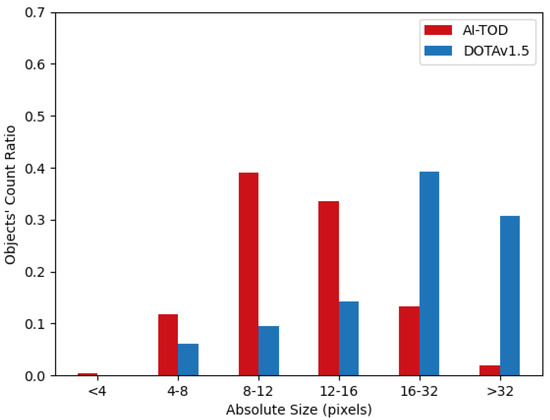 Distribution of different pixel-size objects in AI-TOD and DOTAv1.5.