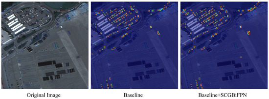 Table 1 shows that YOLOv8s incorporating the SCGBiFPN module resulted in an increase in precision from 0.51 to 0.607, recall from 0.427 to 0.522, from 0.418 to 0.511, and from 0.186 to 0.238, highlighting significant performance enhancements. The testing time and model parameters only increased by 0.2 ms and 0.28 MB, without significantly affecting the detection efficiency. The feature heatmaps in Figure 9 demonstrate that incorporating SCGBiFPN enhances the richness and detail of the model’s extracted features. To confirm SCGBiFPN’s effectiveness, we performed a comparative analysis of SCGBiFPN and BiFPN using the AI-TOD dataset, as summarized in Table 3. The results show that SCGBiFPN surpasses BiFPN in the detection of small objects.