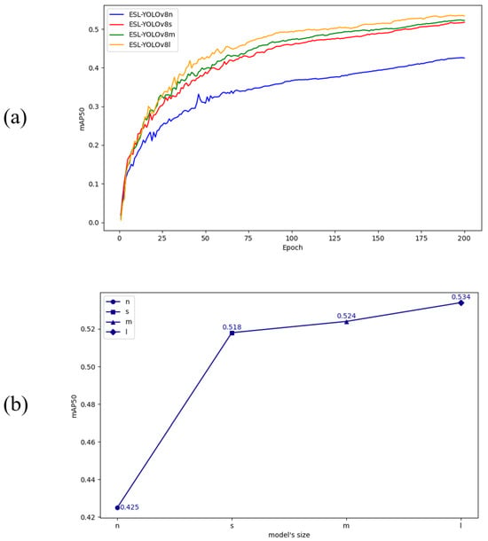 To assess the impact of the proposed improvements on ESL-YOLO with different parameter sizes, we conducted comparative experiments involving four different scale models of ESL-YOLO (n, s, m, l), as illustrated in Figure 11. From Figure 11a, it is evident that with increasing model size, the performance curve ascends more steeply, resulting in higher detection accuracy. In contrast to the other three model sizes, ESL-YOLOv8n shows a slower rate of improvement, primarily attributable to its reduced number of parameters and comparatively weaker feature extraction capabilities, which hinder its ability to achieve higher detection accuracy within a short time frame. Furthermore, Figure 11b demonstrates that as model size increases, correspondingly rises, with ESL-YOLOv8n, ESL-YOLOv8s, ESL-YOLOv8m, and ESL-YOLOv8l attaining values of 0.425, 0.518, 0.524, and 0.534, respectively.