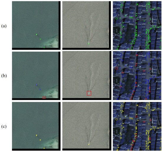 Visualizing the detection results in AI-TOD: (a) Ground Truth; (b) Baseline; (c) ESL-YOLO. Note: The green boxes indicate the actual object boxes. The blue boxes indicate the detection results of the Baseline model. The yellow boxes indicate the detection results of the ESL-YOLO model. The red boxes indicate the undetected results.