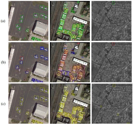 Visualizing the detection results in DOTAv1.5: (a) Ground Truth; (b) Baseline; (c) ESL-YOLO. Note: The green boxes indicate the actual object boxes. The blue boxes indicate the detection results of the Baseline model. The yellow boxes indicate the detection results of the ESL-YOLO model. The red boxes indicate the undetected results.