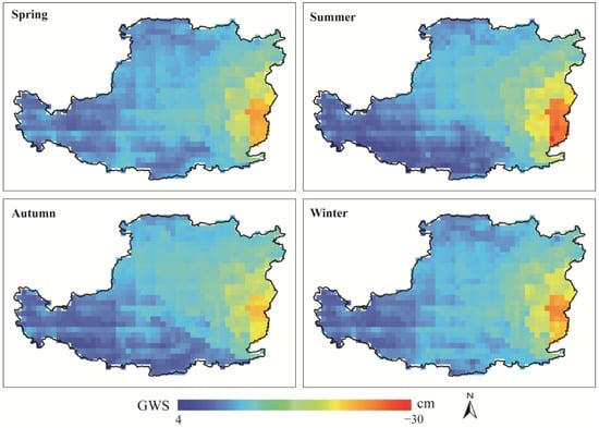 The seasonal distribution of GWS from 2003 to 2022 reveals that the most pronounced groundwater level decline occurred in the eastern region, which is most obvious in summer, showing the largest decrease (Figure 6). The Loess Plateau belongs to the arid continental monsoon climate zone, where rainfall is mainly concentrated in autumn, and groundwater is not recharged in the summer due to high temperatures, high levels of evaporation, and low rainfall. At the same time, summer is also the peak period of water consumption for agricultural irrigation in the Loess Plateau, exacerbating the decline in the groundwater level.
