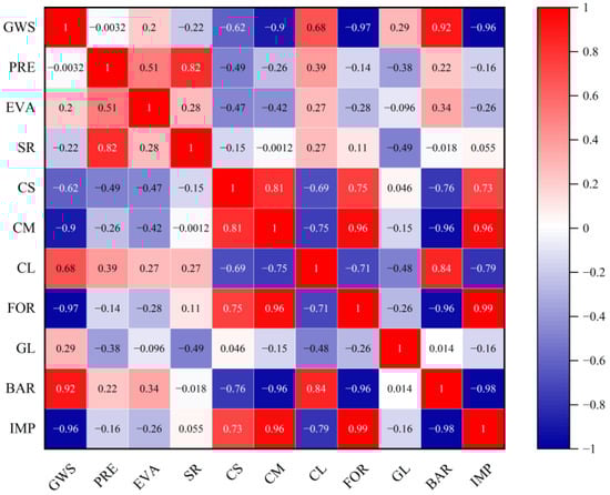 In this study, represents the standardized value of GWS, while denote the standardized values of each influencing factor. The parameter indicates the relative contribution rate of each influencing factor to changes in groundwater depth, and is the regression coefficient for each factor. Independent variables include rainfall, evaporation, runoff, water consumption, land use change, and coal mining from 2003 to 2022, with GWS in the Loess Plateau as the dependent variable. To conduct multiple linear regression analyses, the following conditions must be met: (1) The independent variables must not exhibit multicollinearity, and the Durbin–Watson (D-W) test will be applied to check for autocorrelation. (2) Multicollinearity among the independent variables must be absent, with stepwise regression helping to mitigate this issue.