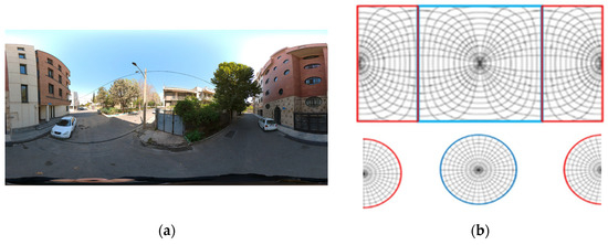 The image produced by this camera (Figure 2a) is an equirectangular projection. In fact, two circular images of fisheye lenses are mapped onto one screen (Figure 2b), which is performedby the camera itself in three steps [31], as follows: