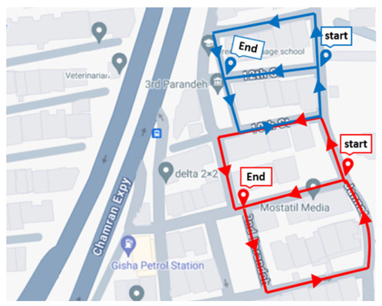 The data acquisition route comprises two red and blue closed loops, measuring 740 m in length, situated in Tehran, Iran on Google Map.