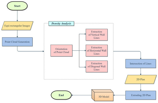 An example of building modeling using a data-driven method is to separate the roof, floor and wall slabs, define the topological relationships between them and create a 3D model. For instance, one study proposed an automated framework that segments planar surfaces and applies contextual reasoning based on height, orientation and point density to classify elements such as floors and walls from point cloud data [12]. Another study introduced a semi-automatic method for interior 3D reconstruction. This method segments walls, ceilings, and floors from point clouds and reconstructs them in the Industry Foundation Classes (IFCs) format for integration into building information models (BIMs) [13]. Additionally, a fully automated method was developed using integer linear optimization to segment rooms, remove outliers and generate interconnected volumetric walls [14]. In addition, the method involves separating the floor and ceiling, followed by segmentation and computation of α-shapes to construct an adjacency graph for intersecting planes. Using a boundary representation (B-rep) approach, an initial 3D model is created, which is then refined by analyzing the adjacency graph of the intersected planes, resulting in a water-tight and topologically correct model [15].