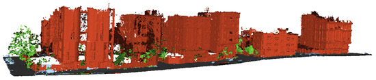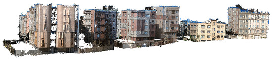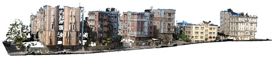 As mentioned in Section 2.1, in the first step of designing a network with ground stations at a distance of two meters from each other and crossing the center line of the street, the images of four building blocks were taken using the Insta 360 One X2 spherical camera. In the second step (Section 2.2), the Metashape software was used to generate a point cloud of the building class (Figure 7) from an equirectangular image.