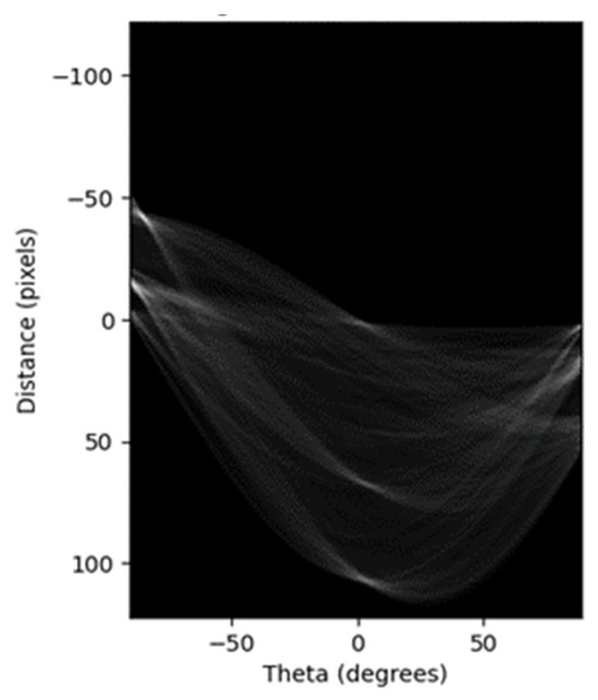 To identify the directional angle on a point cloud using the Hough transform, it is necessary to convert the point cloud into a binary image. First, the 3D point cloud is mapped in the x–y plane and a depth image is generated. To achieve this, the first 4 parameters must be specified as the resolution, minimum and maximum coordinates of the points, and the length based on Equation (1) and width based on Equation (2) of the generated image. Then, the average height of the points in a pixel is taken as its grey level (Figure 8a).