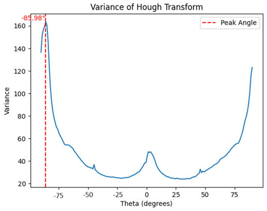One of the limitations of line detection using the Hough transformation occurs when the number of lines is large, causing correlation errors around the peaks of the Hough space curves (Figure 9). As a result, increasing the number of lines leads to ambiguity in line identification. In order to find lines more easily, instead of detecting global maxima, local maxima are detected by plotting the variance graph of the columns of the accumulator matrix (Figure 10) and the largest local maximum in that dominant direction will represent the point cloud [26].