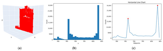 Showing the steps of density analysis on the diagonal wall in the X-axis direction: (a) a point cloud of the diagonal wall mapped on the X-Z plane; (b) a histogram of point cloud voxelization along the x-axis; (c) show the peaks of the point cloud density graph along the x-axis.