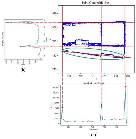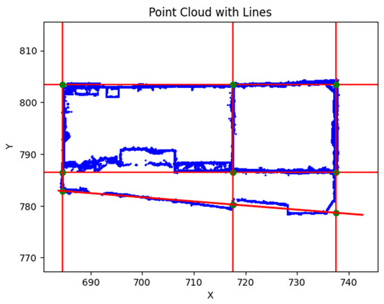 The issue that requires further investigation is that the density analysis was only able to extract the lines of the horizontal and vertical walls, and the diagonal wall lines highlighted in green in Figure 16 were not extracted. As outlined in Section 2.3.4, diagonal wall lines cannot be obtained directly through density analysis. Consequently, initially it is necessary to separate the point cloud corresponding to the diagonal walls from the main point cloud. To do this, according to the coordinates of the points obtained from the intersection of the equation of the line corresponding to the lines of the horizontal and vertical walls in Figure 16, by specifying a y interval for horizontal lines and an x interval for vertical lines, the horizontal and vertical walls are removed from the main point cloud, leaving only the point cloud of the diagonal wall.