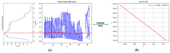 The point cloud of the diagonal wall is transferred to a new coordinate system using principal component analysis. The geometric nature of this transformation makes the maximum density of the point cloud to be aligned with the first principal component. Density analysis in this direction then allows the equation of the diagonal wall line in the system to be calculated (Figure 17a). Ultimately, the objective is to obtain the diagonal wall line in the original coordinate system. This is achieved through the application of the inverse principal component analysis (Figure 17b).